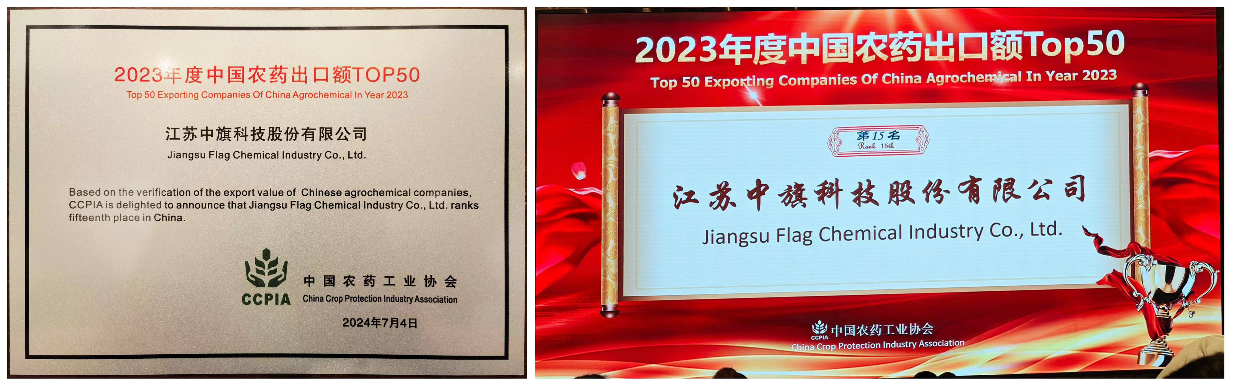 中旗榮獲2023年度“中國農藥出口額TOP50”榜第15名